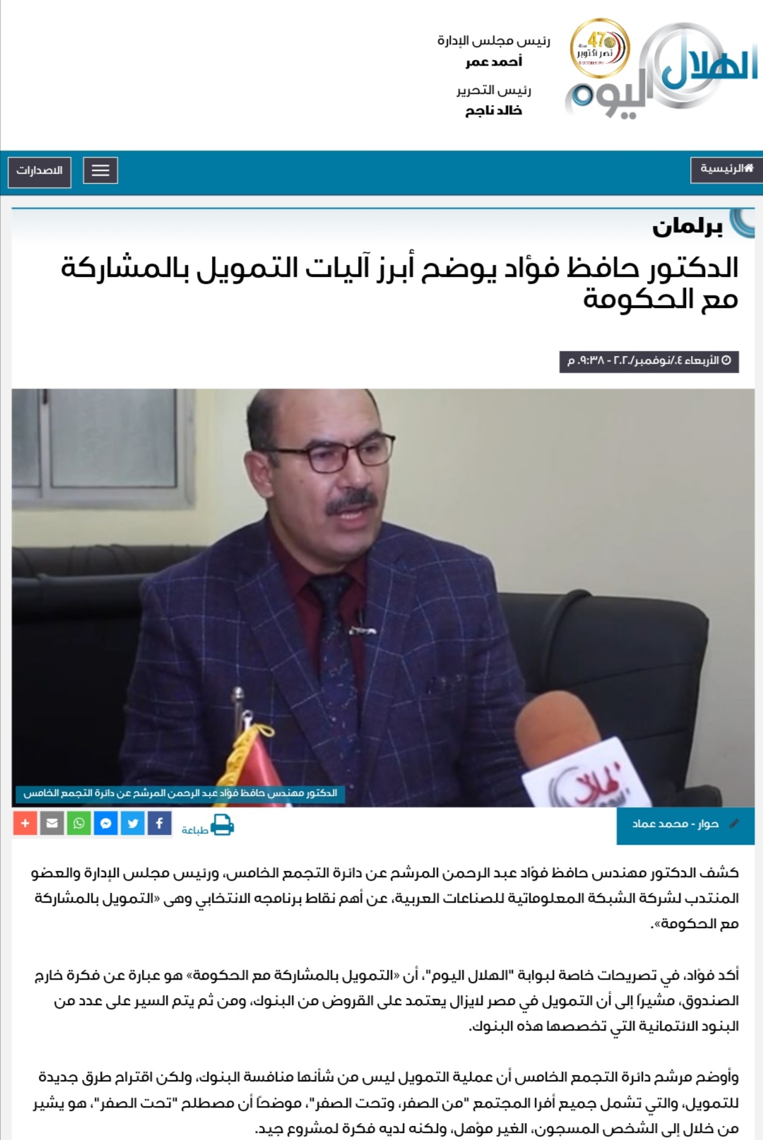 الدكتور حافظ فؤاد يوضح أبرز آليات التمويل بالمشاركة مع الحكومة